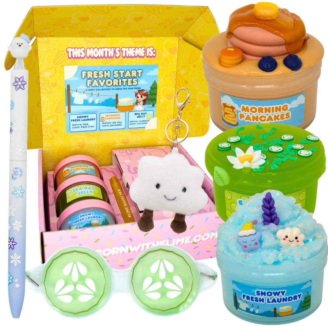 SHIPS JANUARY 12TH 2026 | PRE-ORDER NOW Our January Subscription Box: Fresh Start Favorites ⛅️ includes 3 limited-edition 8oz slimes, each with their own texture, scent, and add-ins. Plus, additional goodies to enhance the experience, featuring a cloud plush keychain, cucumber eye gel mask, snowman gel pen, and an activator magic pen. |